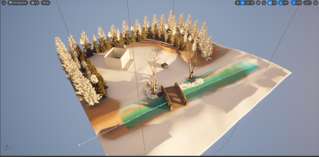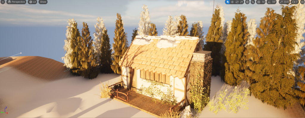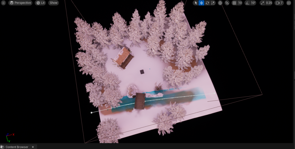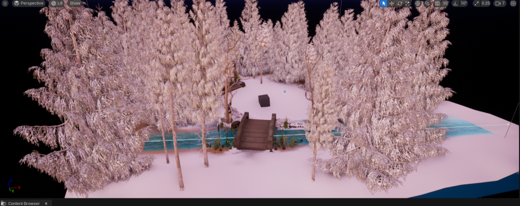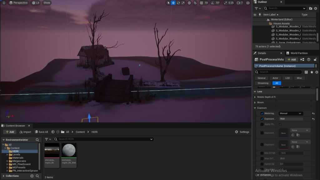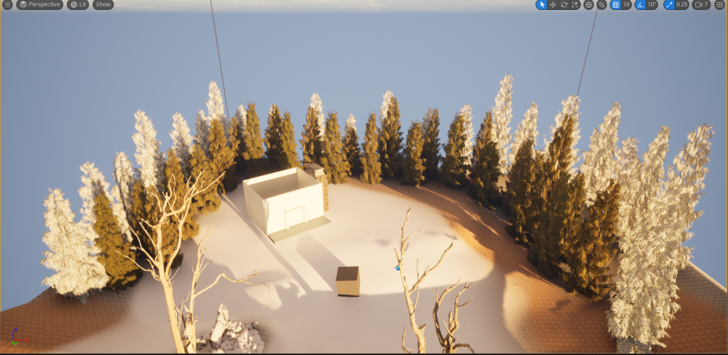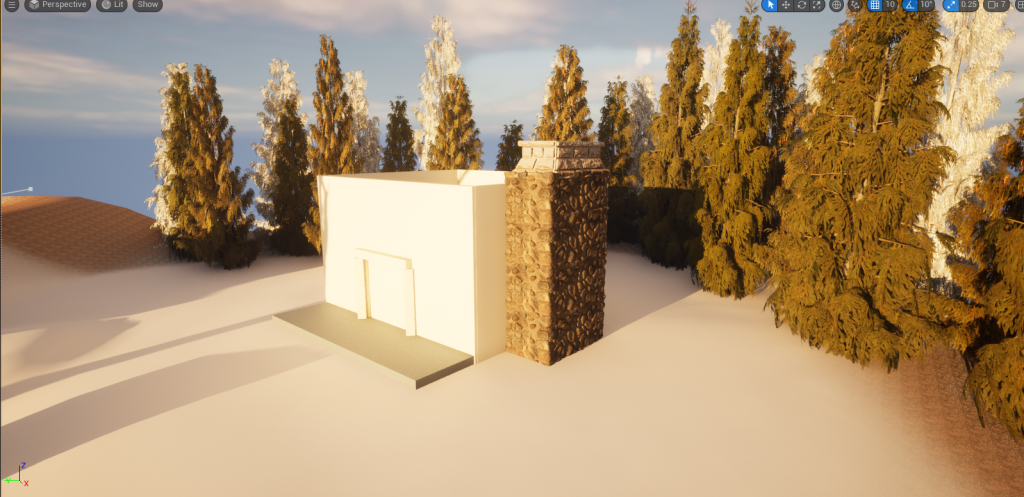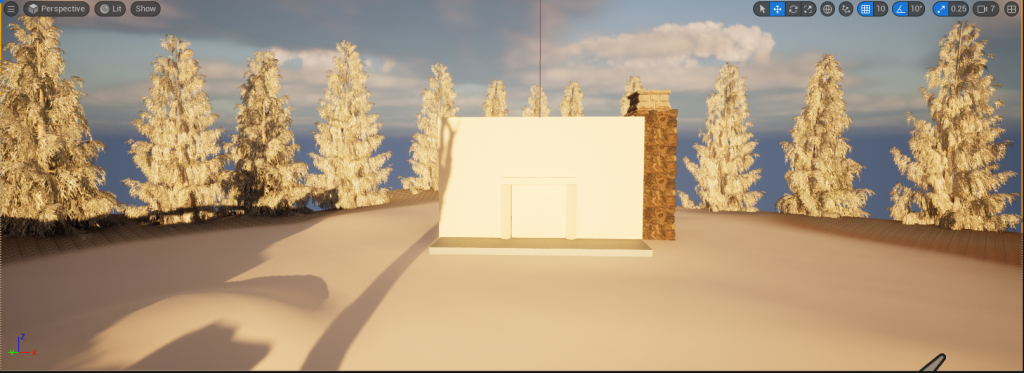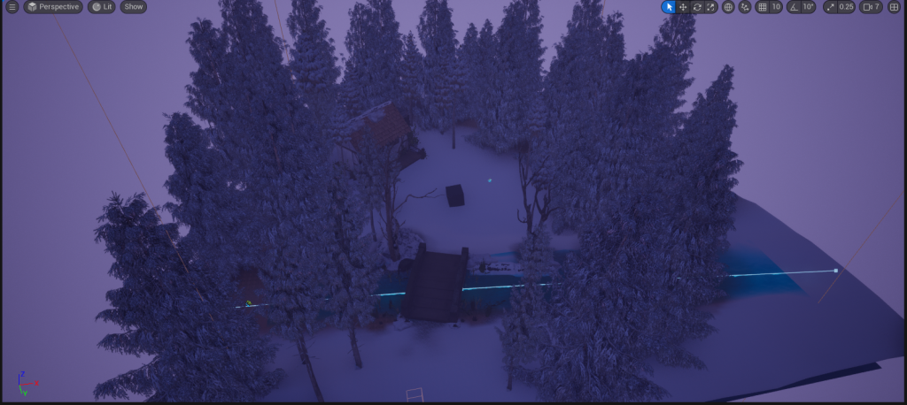 I deleted all of the preset lighting that I had which left me with a pitch-black base I added directional light, sky atmosphere, skylight, and volumetric clouds. I used this tutorial here to help me get the right amount of darkness and atmosphere I wanted which was dark, grey, and foggy: Cinematic Lighting in Unreal 5 (Tutorial)