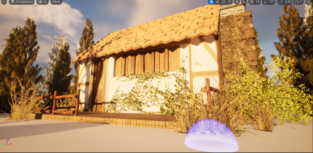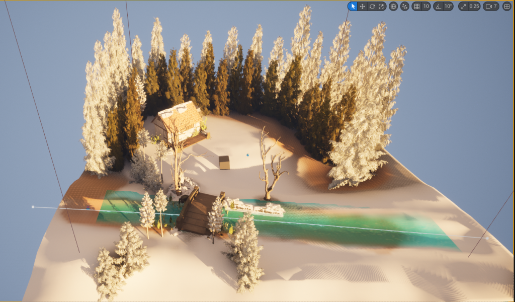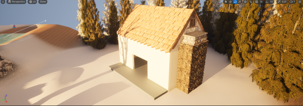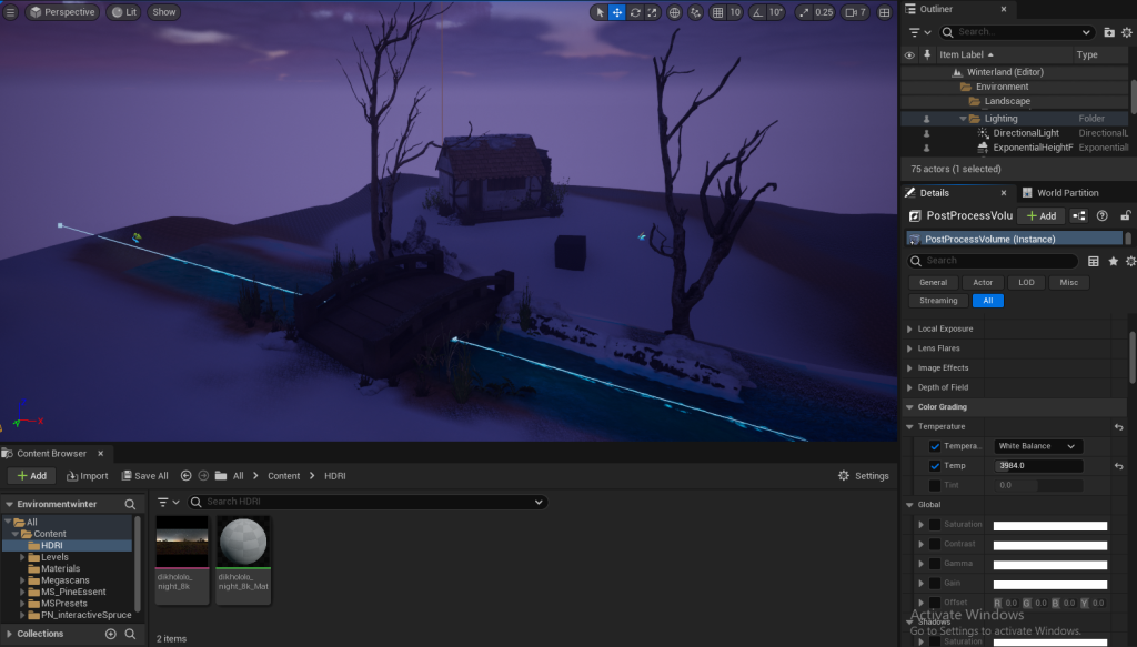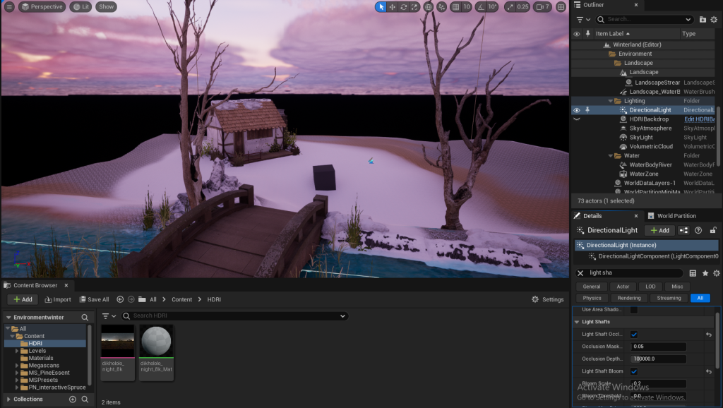 In the directional light settings, I did a few things which the tutorial used including using temperature, cast shadows on the atmosphere, cast cloud shadows, which allowed for the atmosphere to have an effect on the environment, cast cloud shadows allowed the environment to be darker from the clouds casting a shadow over the environment.
