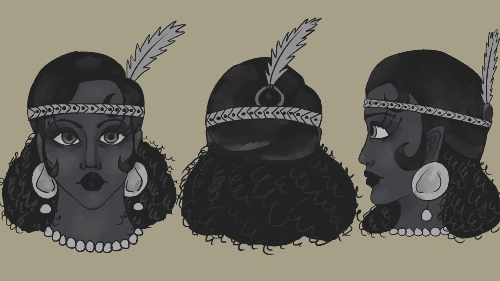 I based her design off of Josephine Baker, who was a Show Girl in the 1920s, at this point I haven’t decided what era to put her in as I felt that she could fit into any of them between this time period.
