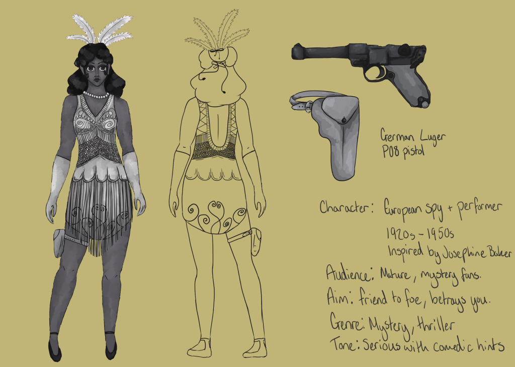 I chose a German Luger P08 for her weapon as I wanted it to be more obvious that she wasn’t just a show girl and I added a holder which is attached to her leg, I got this inspiration from Josephine Baker who after her career she became a spy during WW2.