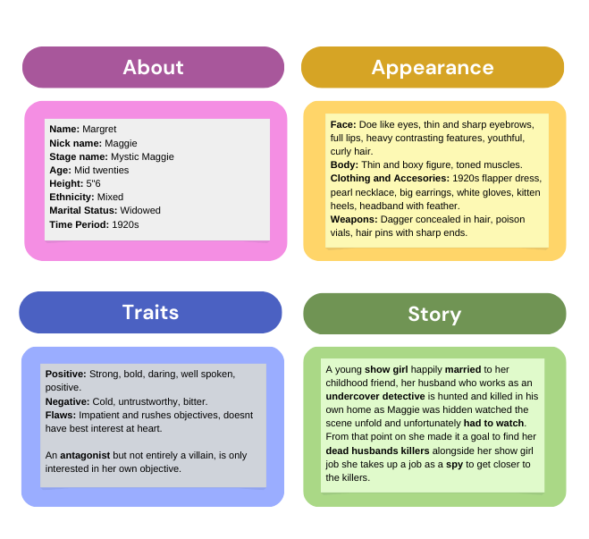 Finally to help me keep consistent with the characters design I decided to create a biography with a bit of backstory and insight into her character and what part she plays.