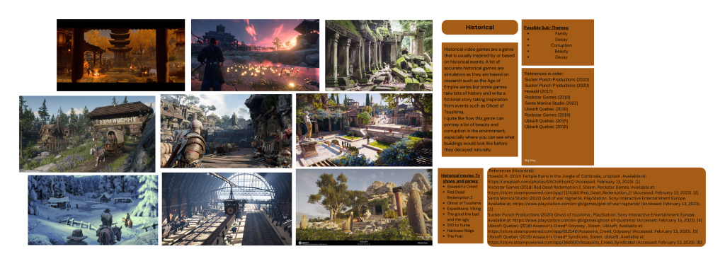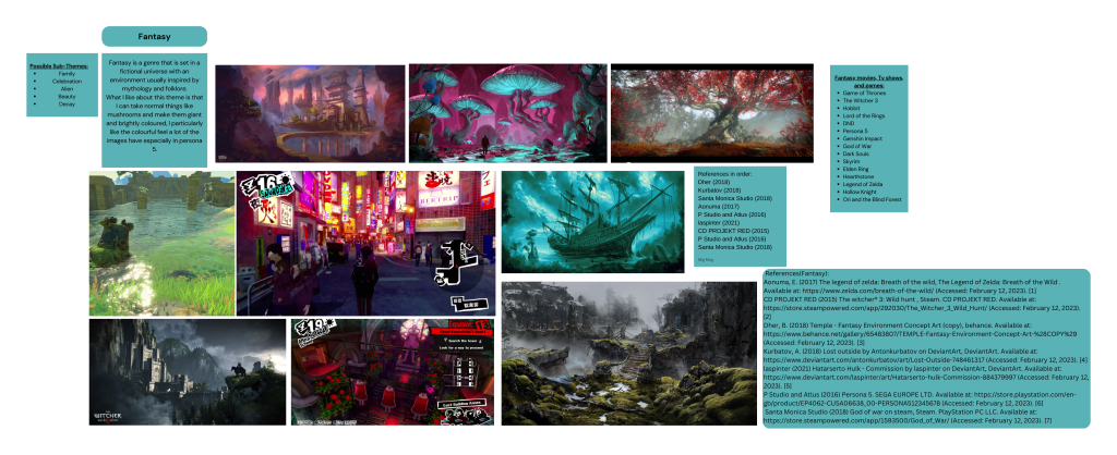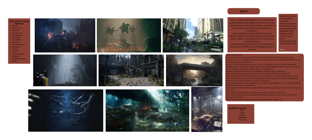 Before starting to design and create a 3D environment, I looked into the themes that I could pick from and explored what I liked the most. Before looking into it I was the most drawn to horror and fantasy as I knew the most about them.