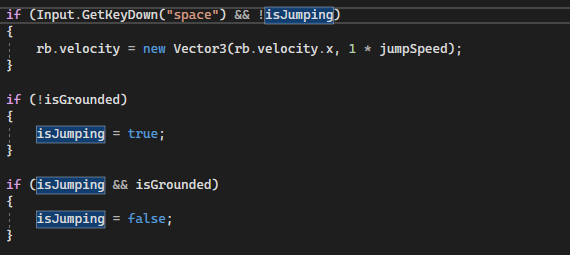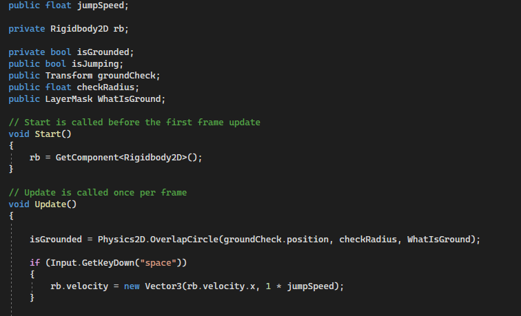 The isGrounded allowed for this script which meant my player could only jump once. If they were off the ground the collider would detect it and highlight the is jumping box and they would not be able to jump anymore, but if the collider detected the player was on the ground they would be able to jump.