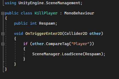 I can place this on any sprite that has the collider 2D in its components, including invisible blocks! which is what I placed below the scene so if the player fell off the map they will be placed right back at the start.