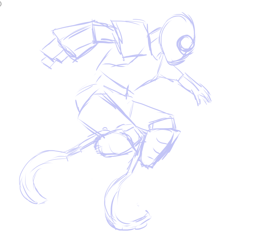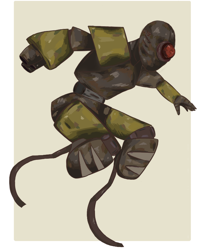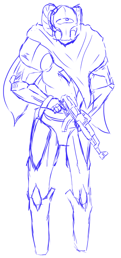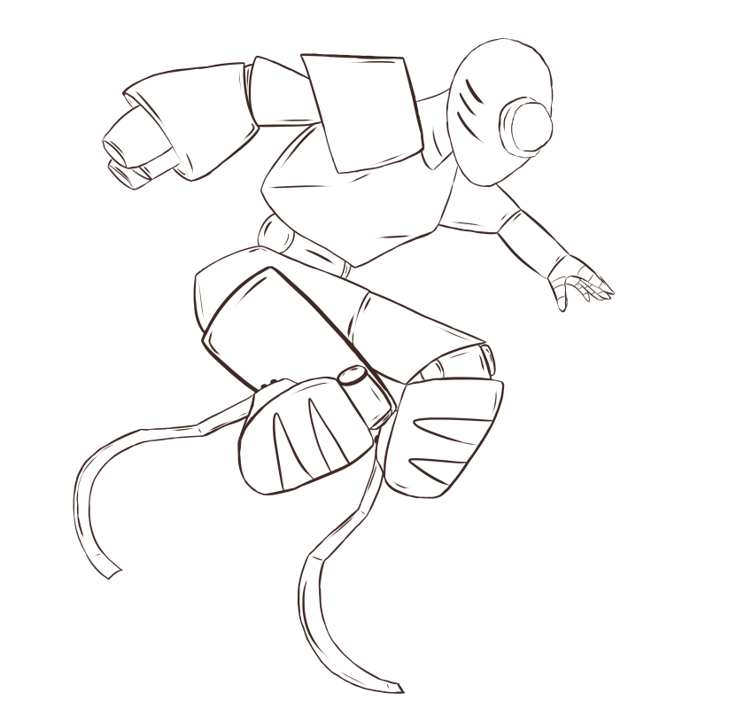 I used the software ‘Krita’ to draw this character as I did this in my own time so some of the tools worked a little differently than they do in photoshop. I started with an image I found off of google for the body pose reference and traced over it to give me a general idea of the body, I then added a new layer and used shapes like rectangles and ovals to create the limbs, this is where I decided to add a gun to one of the arms as I wanted the whole design to fit together rather than have something that looks optional to the character.