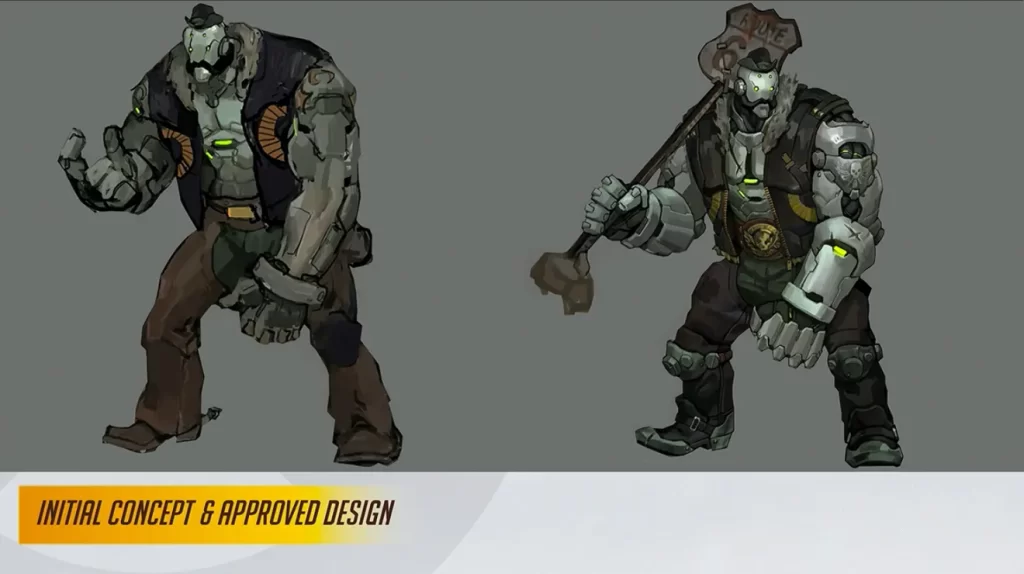 I first thought of Bob from Overwatch as I like the simple design of the head and the whole design of him feels somewhat passive and soft but the body makes him look ready for battle. I particularly like how his round shape makes him look more like a protector rather than an enemy.