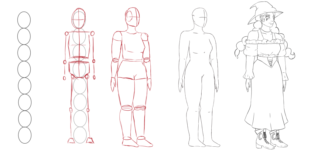 I started by using 8 equal circles, this helped to create the right body proportions with the help of a guide I was able to make a body using shapes before turning it to the side. I used a different colour to help myself distinguish between the circles and the body I drew on top.