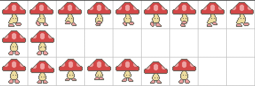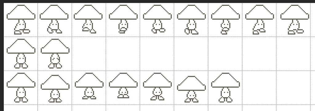 I started with the player character, I liked the design of Kirby and didn’t really want to make something too complicated, this gave me an idea for a little mushroom. Some of the things I had to take into consideration were that the character had to be bipedal (meaning they walk on two legs), its jump should double as an attack and the colours should be suitable for a younger audience.